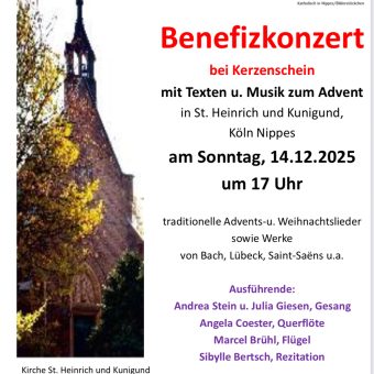 Adventliches Konzert im Klangraum Kunigunde in Köln Nippes. Hören Sie traditionelle Weihnachtsmusik zum Advent und Geschichten und Gedichte zwischen den Liedern und Musikstücken. 14.12.2025 um 17:00 Uhr. Kirche St. Heinrich und Kunigunde, Simon Meister Straße 1, 50733 Köln Nippes. Eintritt frei Spenden erbeten für das Ronald McDonald Haus mit Oase Köln.